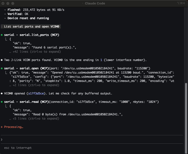 Tools are discovered automatically. Everything — tool calls, results, reasoning — flows through the same terminal session. For permissions, /permissions supports wildcards: mcp__ble__* allows all BLE tools, mcp__dbgprobe__* allows all debug probe tools.