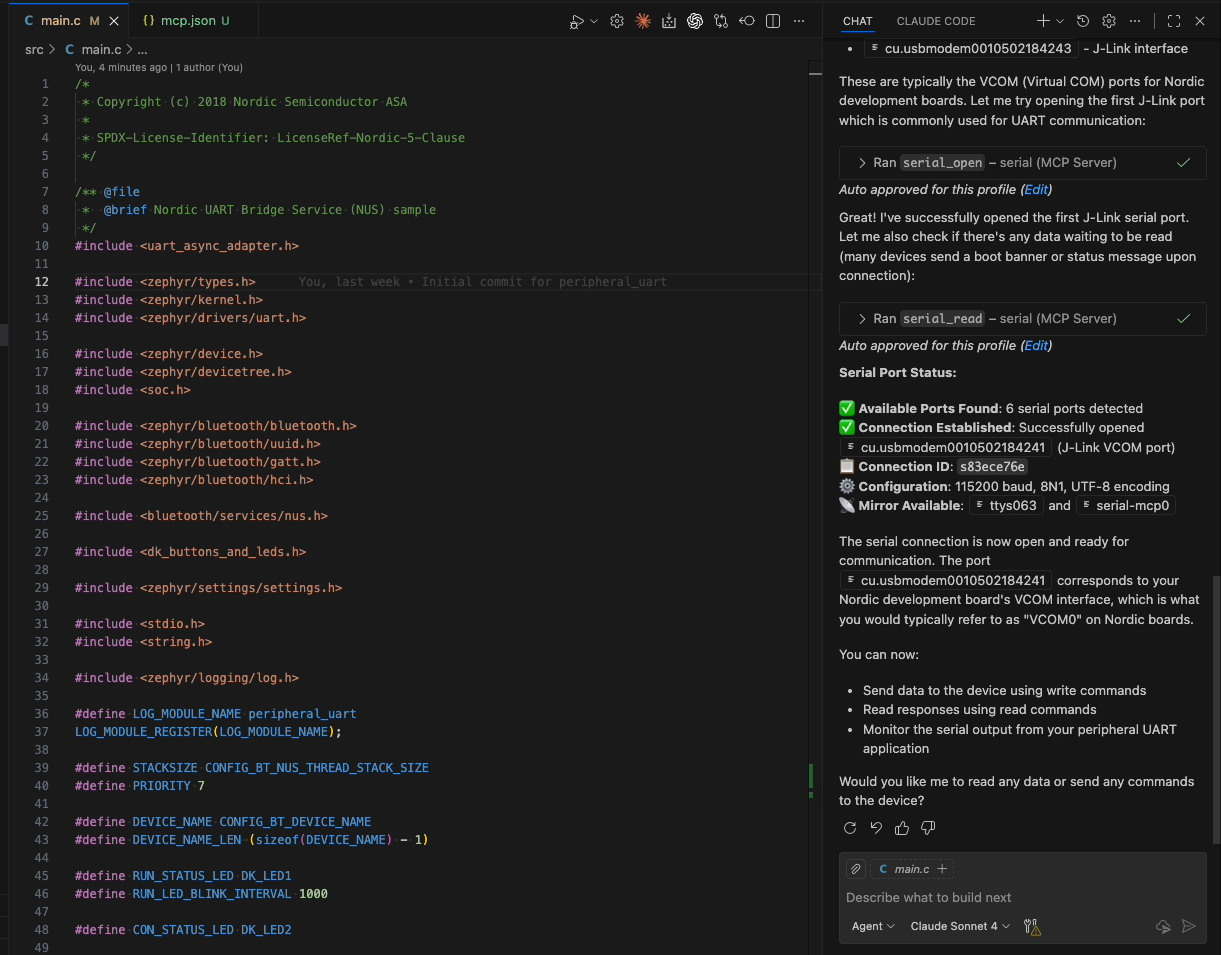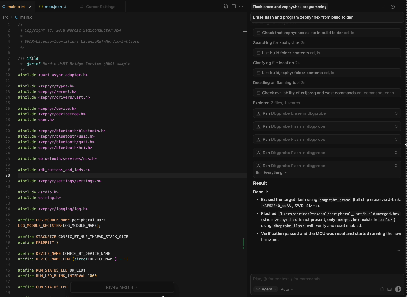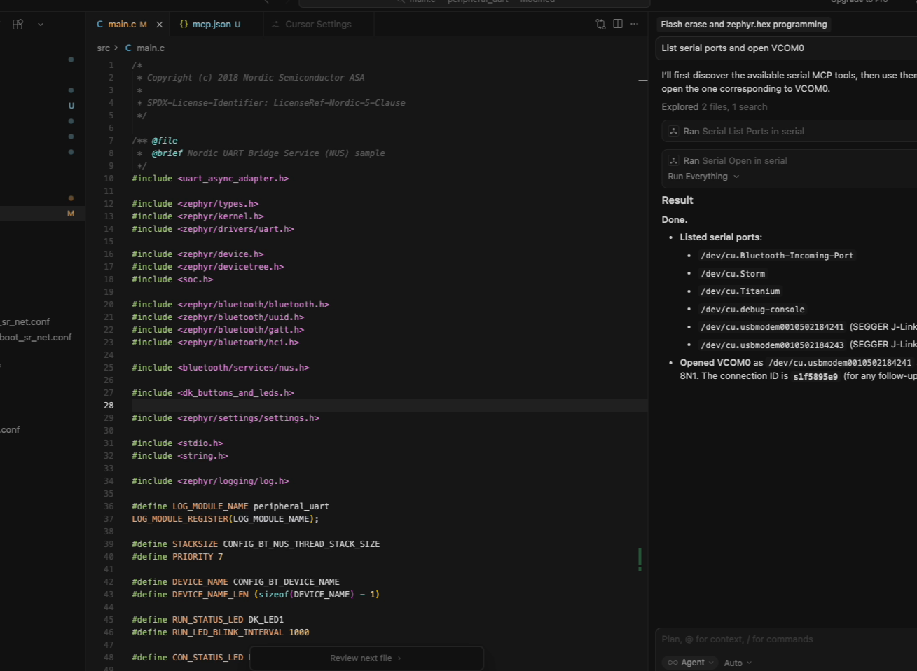 To test whether the same MCP servers behave consistently across different agent clients, I ran the same workflow against a Nordic nRF52840 development kit running Zephyr’s Peripheral UART sample.